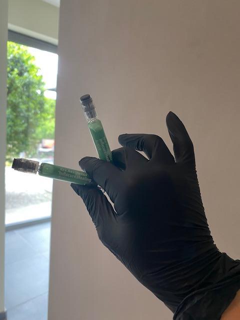Verzorging met een zachte peel van melkzuur waarbij een ampoule wordt aangebracht met botanische extracten, chlorofyl & ureum.